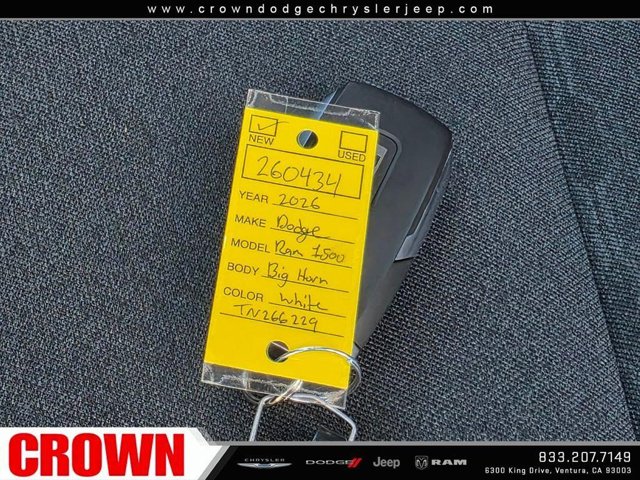 Bright White Clearcoat 2026 Ram 1500 Big Horn/Lone Star 4WD 8-Speed Automatic HEMI 5.7L V8 Multi Displacement VVT eTorqueHere at Crown Dodge Chrysler Jeep RAM, we believe that great service means more than just offering our new Dodge, Chrysler, Jeep, and RAM lineup. We believe that great service also includes helpful advice, friendly car financing, and the highest quality parts and repairs for your car. Our staff works hard to make your full automotive experience at our car dealership in Ventura, CA enjoyable, and we look forward to helping you today! All vehicles at Crown Dodge have our SWAT security system $995, Nitro $499, Clear Shield $395, touchscreen $395, wheel locks $395, windshield treatment $995, pulse breaking lights $395, paint and fabric protection, $1295pre-installed, Battery For Life $995.Crown Trade in Bonus $2500 Must trade in a 2019 or newer vehicle on a retail purchase. Trade in must have less than 15,000 miles per year, clean title, and vehicle history report. Must finance through Crown Preferred Lending Financial institutions to qualify, all subject to approved credit. Minimum amount financed $30,000 ENDS 03/31/2026 STANDALONE APR financing is offered as a standalone incentive and is not eligible for combination with any other offers, incentives, or discounts. Price includes: $1000 - 2026 West BC Engine Retail Bonus Cash. Exp. 03/31/2026 $3500 - 2026 National Retail Bonus Cash . Exp. 03/31/2026